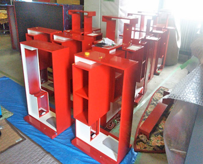 新規製作什器の仕様打合せ ⇒ 実施図の作図 ⇒ 製作段取り ⇒ 製作 ⇒ 倉庫内アッセンブリー作業