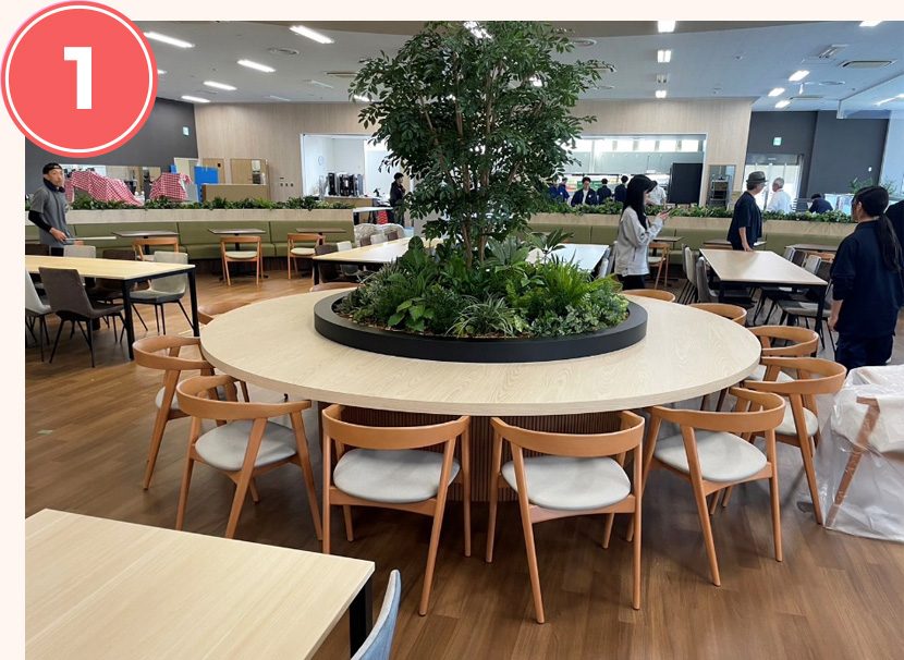 多くの従業員さんが利用される大手企業様の食堂なのでスペースも広く席数も多い上に、植栽(グリーン)をふんだんに盛り込んだ明るく温かみのある空間というような全体イメージなのかな、と、お見受けします。