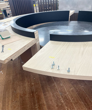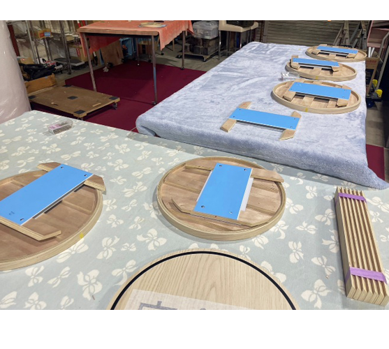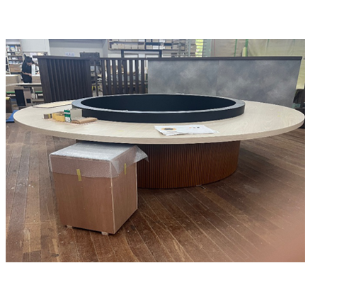 このテーブル、縦割り4分割なので外側からの見た目としては、天板部分と腰部分に4か所のジョイントが入るわけですがジョイントのつなぎ目が目視では分からないレベルで仕上がっており、現場で違う作業者の手で組んでもほぼ同じ精度で組みあがりました。