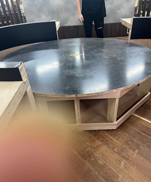 今回弊社が製作させていただいた造作家具も植栽が装飾される円形のテーブル2台と、メニューを掲示する為のボードを兼ね備えたルーバータイプの間仕切りのような什器です。