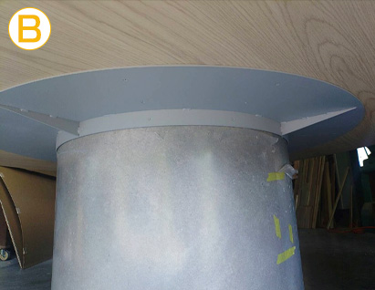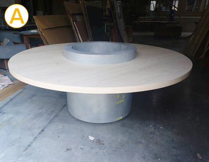 Bの写真はテーブルの裏側ですが天板強度はこれでOKですがあとは胴体を床へしっかり固定するのがマストです。胴体の地板面から数か所アンカーを打ちたかったので内部の落とし蓋の天板は先に固定せずに胴体は石臼のような状態で現場納入。現場で位置を決めたら、胴体の地板に金物の円形プレートを重ねて仕込みその上(中)から床へアンカーを5ヵ所打ちました。最後に、植栽を受ける為の落し蓋としての天板を上から固定しています。胴体の内側から床へ固定する為に内部の天板はあえて現場で後付けとしてあるのです。