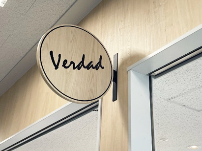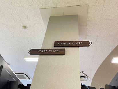 サインの面板にも、什器と同じ化粧板がそれぞれご指定されており食堂空間の中での統一感がございました。